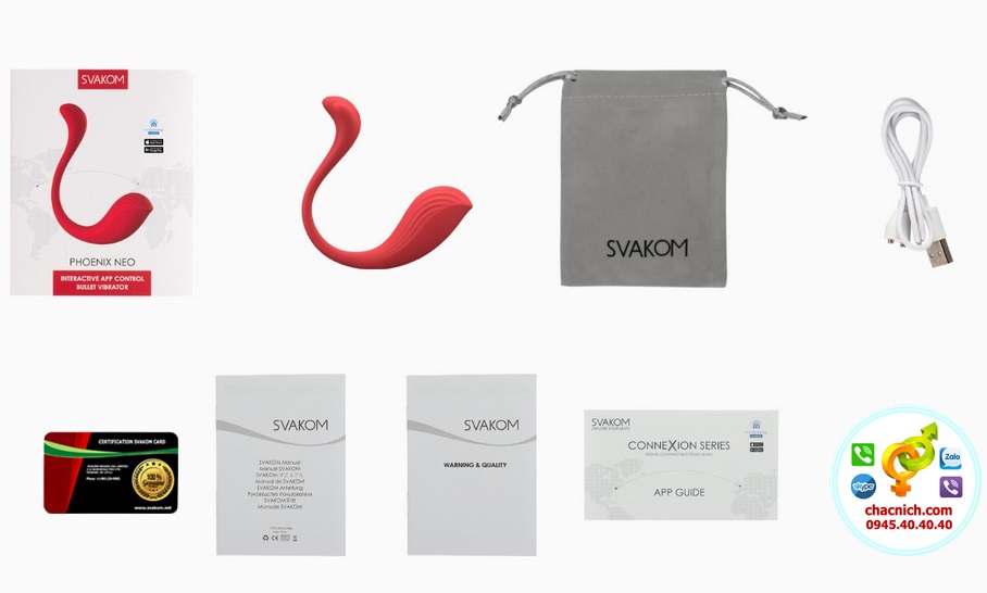 - Đơn vị: Hộp 1 trứng rung, 1 cáp sạc, 1 túi lụa satin, 2 sách giới thiệt và hướng dẫn sử dụng, 1 card Svakom chính hãng